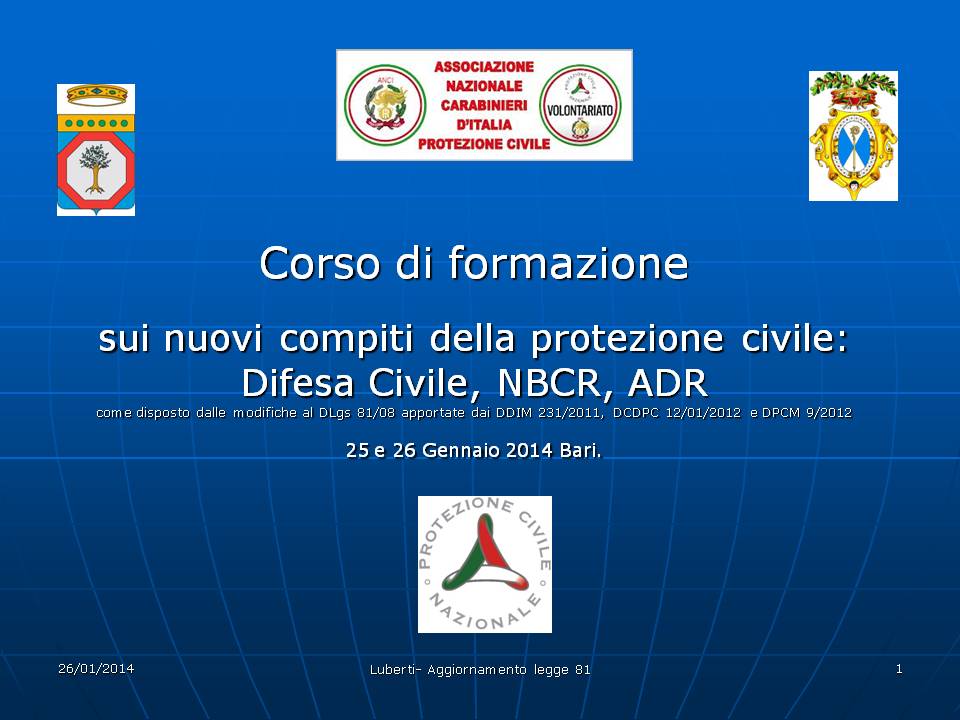 Corso sui “Nuovi compiti della Protezione Civile: Difesa civile, Difesa NBCR, ADR”. Bari, 25 e 26 Gennaio 2014.