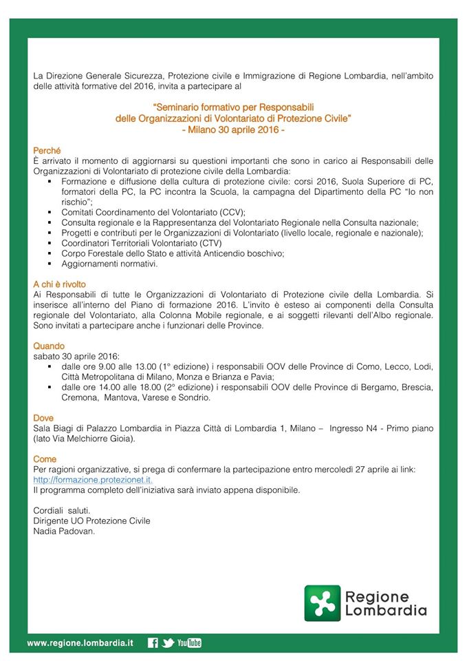 Sabato 30 Aprile, presso la sede della Regione Lombardia, (uscita MM Gioia), ingresso N4 Primo piano, Sala Biagi, ci sarà un “Seminario formativo per Responsabili delle Organizzazioni di Volontariato di Protezione Civile”.