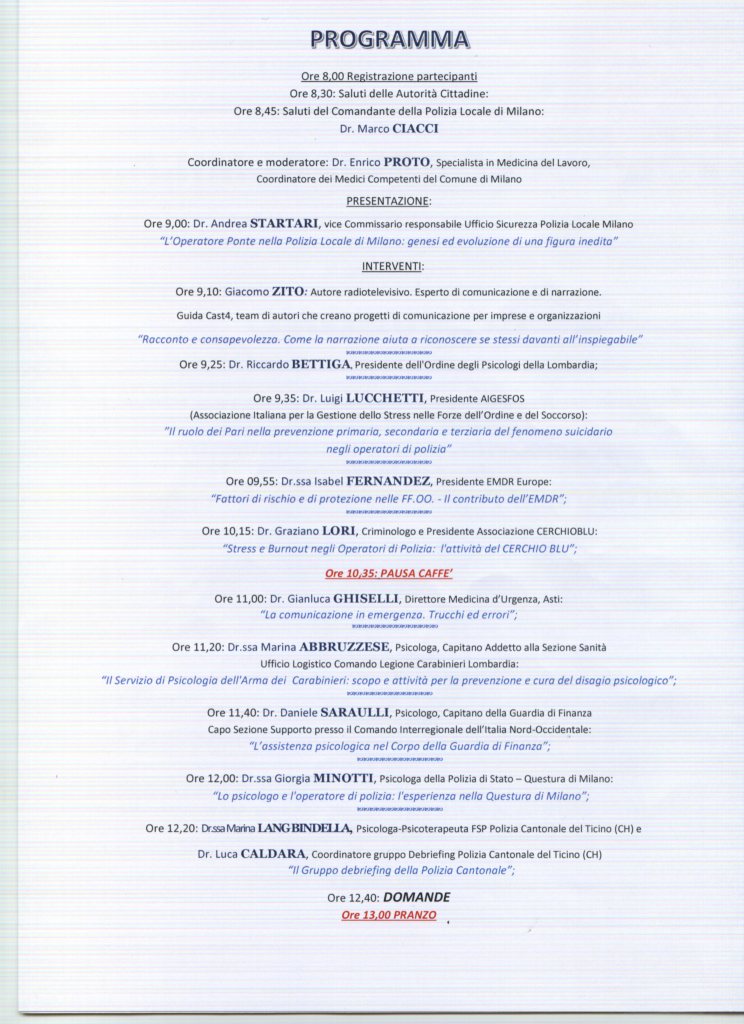 Primo convegno sul Supporto psicologico nelle Forze di Polizia e del soccorso tenuto dalla Polizia Locale di Milano, in collaborazione con numerose Organizzazioni del settore.