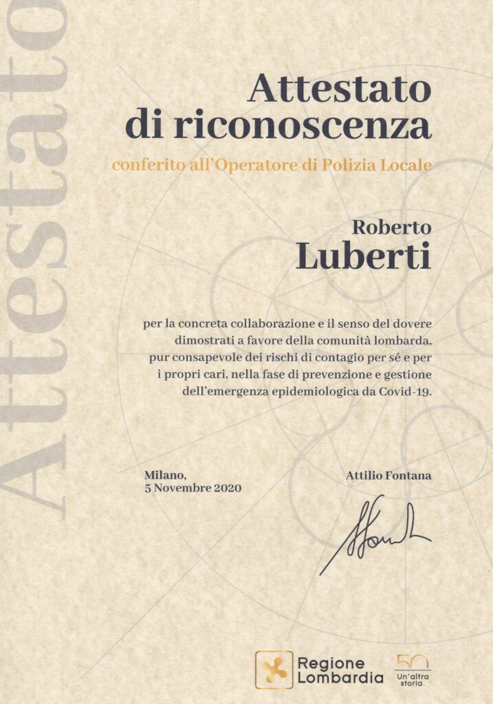 Attestato di riconoscenza Regione Lombardia per l’emergenza Covid